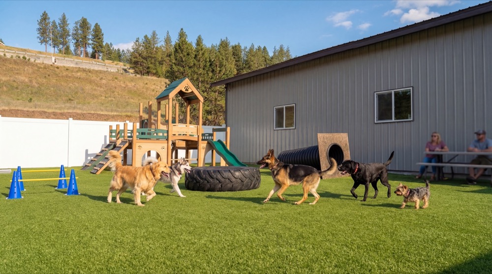 Outfitted with lush artificial turf, cooling sprinkler systems, agility equipment, water splash toys, and plenty of shaded relaxation zones. Whether they zoom through agility tunnels or just splash around, it's their happy place.